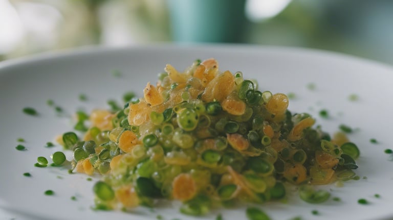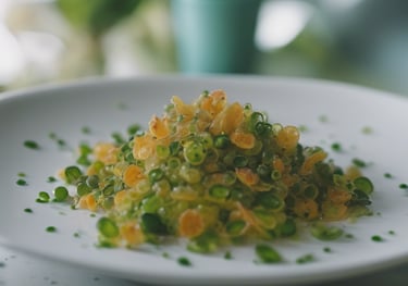 "Seaweed salad is a delicious and refreshing dish often enjoyed as an appetizer or side dish. In this presentation, the salad is enhanced with grated coconut, adding a subtle sweetness and texture to the dish. The vibrant green color of the seaweed stands out on the white platter, creating an aesthetically pleasing combination of colors. The salad is carefully arranged on the dining table, capturing guests' attention with its visual allure. The freshness of the seaweed combined with the tropical flavor of coconut makes this salad a perfect choice for those seeking a light and healthy food option."